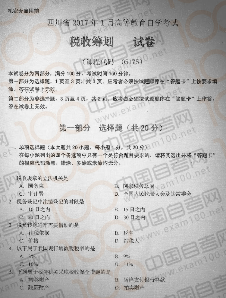 四川2017年1月自考05175《税收筹划》真题
