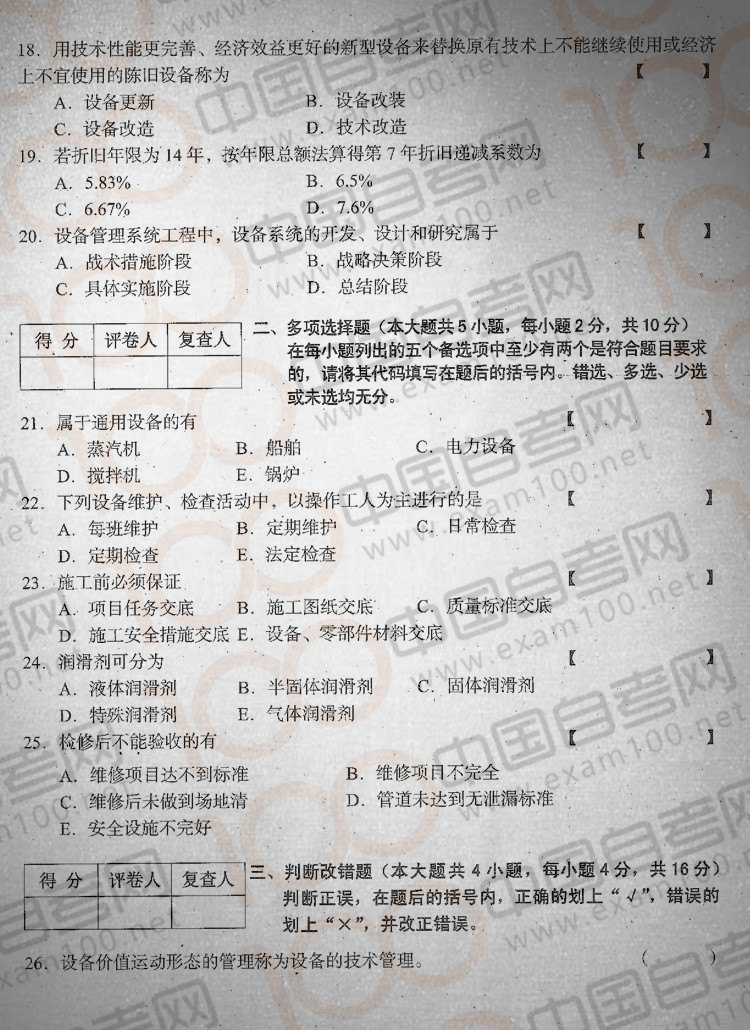 四川2016年4月自考08300《机电设备管理》真题