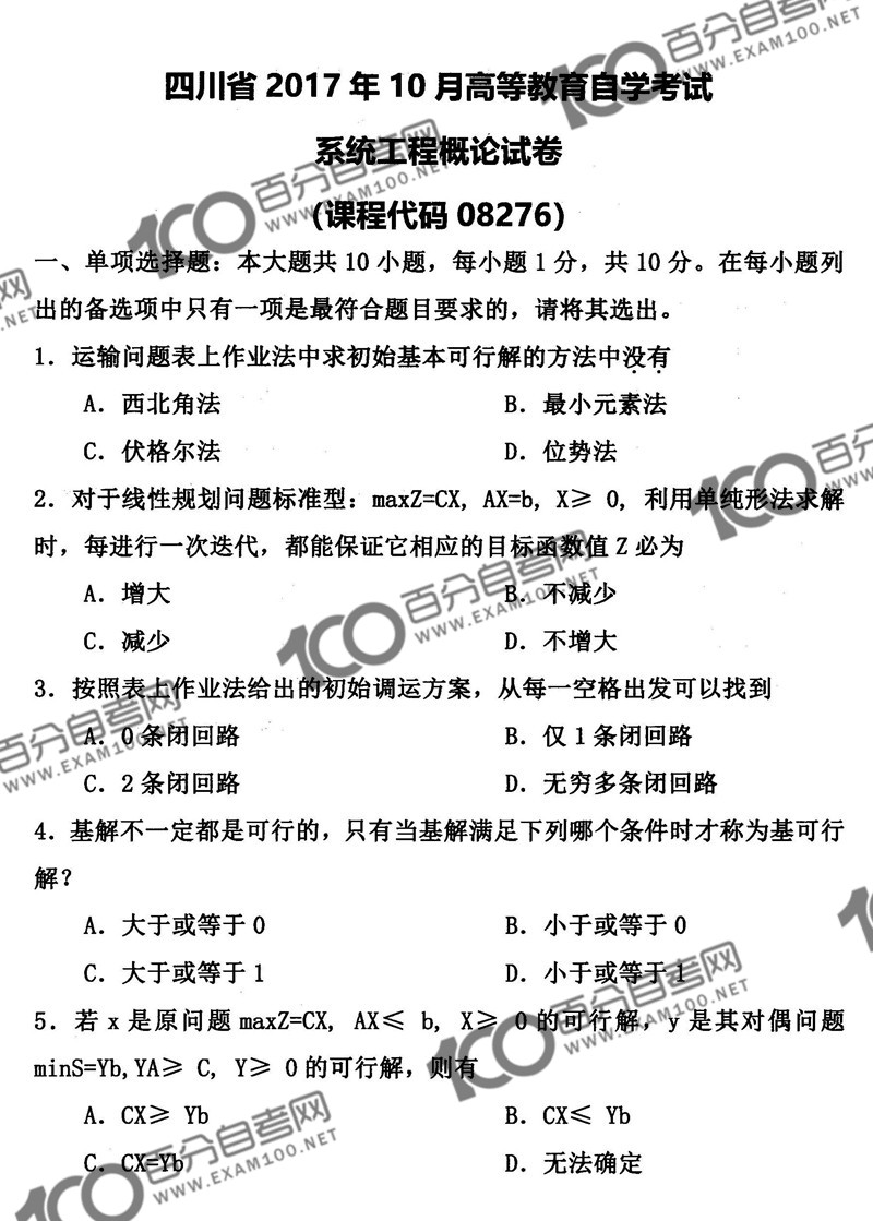 四川2017年10月自考08276《系统工程概论》真题